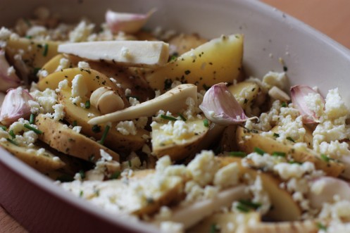 - Zemiaky si umyjeme, osušíme a nakrájame na štvrťky. Takisto aj petržlen. Jarnú zeleninku netreba šúpať, v šupe je kopec vitamínov. Cesnak si oddelíme na strúčiky a v celosti aj so šupou pridáme k zmesi. Polejeme olivovým olejom, posypeme rascou, čerstvými bylinkami pažítkou, petržlenovou vňaťou, šalviou, tymiánom, rozmarínom, bryndzou, premiešame a ešte aj vrch posypeme bryndzou. Ak nemáte, použite aké máte, príp. pizza korenie. Dáme piecť do rúry na 180 stupňov cca 20-30 minút dozlata.